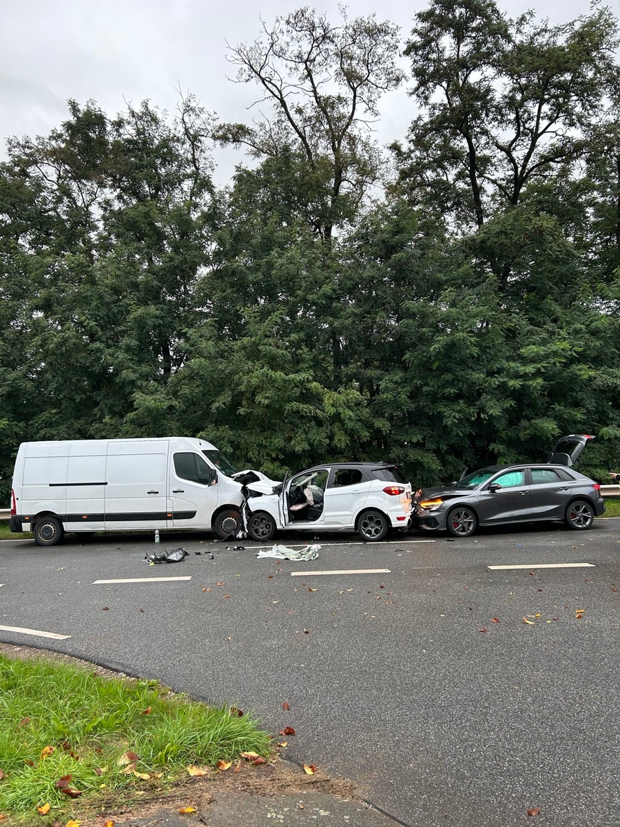 Nach bisherigen Erkenntnissen überholte ein Transporter, der in Richtung Köwerich unterwegs war, auf einer langen Geraden einen vorausfahrenden LKW. Aus bislang ungeklärter Ursache kollidierte er frontal mit einem entgegenkommenden PKW. Ein nachfolgender Pkw konnte nicht mehr rechtzeitig bremsen und prallte ebenfalls auf den vorausfahrenden Wagen.